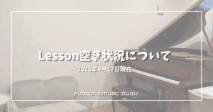 こんにちは🎼euphoria music studioのyukaです♪ まいにち投稿98日目! 本日はLessonの空き状況についてお知らせします📢 大変ありがたいことにまいにちブログ投稿をはじめてからたくさんの方にわた […]